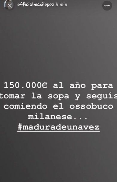 Si bien esta no es la primera vez que Nara hace referencia al tema, Maxi volvió a contestar por medio de la misma vía, pero con una insólita metáfora sobre los alimentos: “150 mil euros al año para tomar la sopa y seguís comiendo el ossobuco milanese… #maduradeunavez”, publicó el delantero del Vasco da Gama.