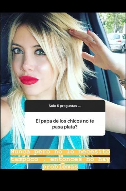 “¿El papá de los chicos te pasa plata?”, le consultaron a través de la opción “Hazme una pregunta” que ofrece la red social y que es furor entre los famosos. Sin vueltas, Wanda respondió: “Nunca, pero no lo necesito tampoco, entonces no hay problema”.